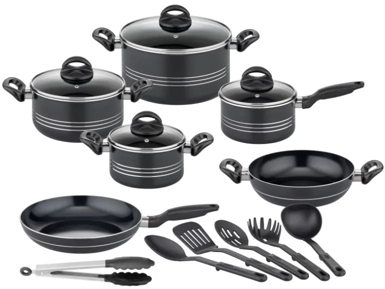 Das für Induktion geeignete Kochtopf-Set aus dem Hause GSW kann auf allen Herdarten benutzt werden und beinhaltet ein zusätzliches Küchenhelfer-Set aus Kunststoff für den praktischen Einsatz in der Küche. Die Töpfe und Pfannen bestehen aus einer hochwertigen, robusten Aluminium-Legierung und verfügen über eine neuartige PFAS-freie Antihaft-Versiegelung mit brillantem Finish und einer ausgezeichneten Antihaftwirkung, welche extrem hart und kratzfest ist. Das moderne und zugleich zeitlose Design wird durch die formschönen Kunststoffgriffe und Glasdeckel mit Dampfaustritt abgerundet. Durch die Verwendung von Aluminium bei der Herstellung der Töpfe und Pfannen, ist eine optimale Wärmeleitfähigkeit gegeben, welche ideal für fettarmes und krosses Kochen und Braten geeignet ist. Zudem verfügen alle Töpfe und Pfannen über einen energiesparenden, extra starken FerroTherm®Boden, welcher eine optimierte Hitzeverteilung auf allen Herdarten inklusive Induktion gewährleistet. Mit diesem Kochtopf-Set aus dem Hause GSW wird die Küche um formschöne und praktische Utensilien ergänzt. Das Set besteht aus: Kochtopf mit Glasdeckel ø 16 x H 8,5 cm, ca. 1,5 L / ø 20 x H 10,0 cm, ca. 2,9 L / ø 24 x H 12,0 cm, ca. 4,8 L / Stielkasserolle mit Glasdeckel ø 16 x H 8,5 cm, ca. 1,5 L / Servierpfanne ø 24 x H 5,8 cm, ca. 2,1 L / Bratpfanne ø 28 x H 5,0 cm, ca. 2,3 L / Soßenlöffel / Pfannenwender / Servierlöffel / Spaghettilöffel / Schöpflöffel / Servierzange. Alle Bestandteile sind spülmaschinengeeignet und die Töpfe und Pfannen können zudem im Backofen bei maximal 180°C verwendet werden.- Kochtopf mit Glasdeckel 16 x 8,5 cm / ca. 1,5 L- Kochtopf mit Glasdeckel 20 x 10,0 cm / ca. 2,9 L- Kochtopf mit Glasdeckel 24 x 12,0 cm / ca. 4,8 L- Stielkasserolle mit Glasdeckel 16 x 8,5 cm / ca. 1,5 L- Servierpfanne 24 x 5,8 cm / ca. 2,1 L- Bratpfanne 28 x 5,0 cm / ca. 2,3 L- Küchenhelfer-Set 5-tlg.- Servierzange