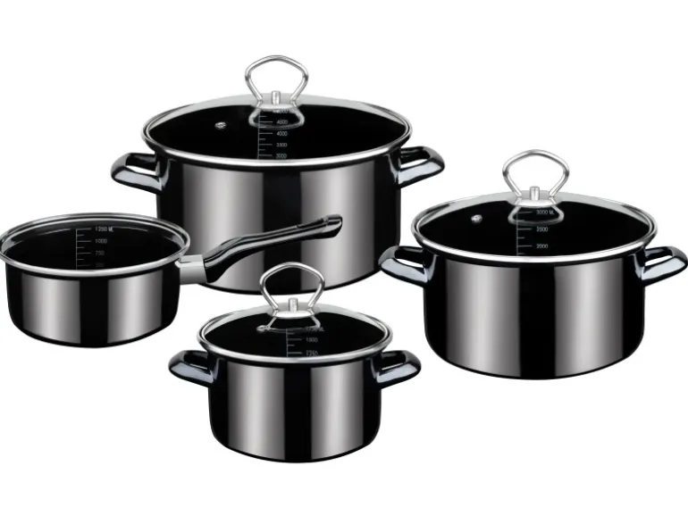 Dieses Kochtopf-Set ist aus extra schwerem Stahl-Emaille gefertigt und verfügt innen über eine praktische Literskala. Zudem sind die Töpfe innen und außen leicht zu reinigen, schnitt- und kratzfest, sowie nickelfrei und daher ideal für Allergiker geeignet. Außerdem ist dieses Kochtopf-Set für alle Herdarten – auch für Induktion geeignet und besteht aus: Fleischtopf mit Glasdeckel ø 16 x H 9,5 cm, ca. 1,8 L / ø 20 x H 11,5 cm, ca. 3,4 L / ø 24 x H 13,5 cm, ca. 5,5 L / Stielkasserolle ø 16 x H 8,0 cm, ca. 1,5 L. spülmaschinengeeignet.