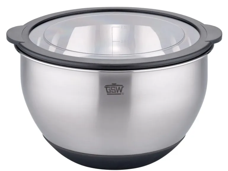 Die aus hochwertigem Edelstahl rostfrei gefertigte Schüssel aus dem Hause GSW verfügt über eine innenliegende Listerskala und einen luftdichten Aufbewahrungsdeckel mit Sichtfenster. Zudem dient der Antirutsch-Silikonboden beim Zubereiten und Servieren für einen sicheren Stand. Die Schüssel eignet sich daher hervorragend zum Zubereiten, Servieren und Aufbewahren und ist durch das zeitlos moderne Design ideal für den gedeckten Tisch, die Party und das Buffet geeignet. Alle 3 Größen sind ineinader stapelbar und können somit platzsparend gelagert werden. Mit dieser Schüssel aus dem Hause GSW wird die Küche um formschöne und praktische Utensilien ergänzt. Spülmaschinengeeignet. Servierschüssel mit Deckel 20 x H 12 cm, ca. 2,8 L