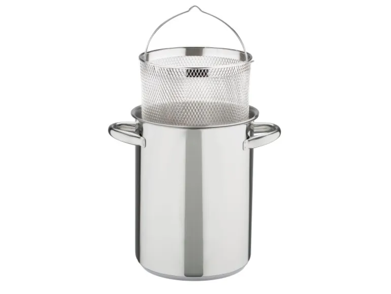 Dieser Spargeltopf ist aus hochwertigem Edelstahl rostfrei 18/8 gefertigt und verfügt über einen praktischen Einsatzkorb. Der extra starke, verkapselte Thermoboden und die wärmeabweisenden Edelstahlgriffe sorgen für einen großen Spaß beim Kochen. Der Topf ist für alle Herdarten – auch für Induktion geeignet. Spargeltopf mit Glasdeckel und Einsatz ø 16 x H 21,0 cm, ca. 4,2 L. Spülmaschinengeeignet.