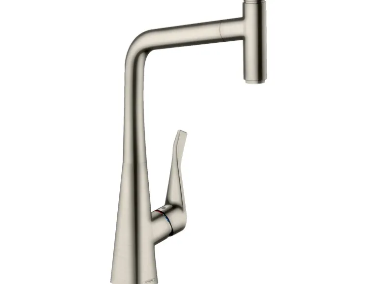 Hände voll? Für den Hansgrohe Metris Select Küchenmischer kein Problem. Starten und Stoppen Sie den Wasserfluss ganz einfach durch Drücken des Select-Knopfs. Das ist auch einfach mit dem Ellenbogen oder Handrücken möglich. Durch den Ausziehauslauf gelingt auch das Befüllen von Töpfen in geringer Entfernung ohne Probleme. Die MagFit Brausehalterung sorgt zusätzlich für eine einfache und nahezu geräuschlose Rückführung des Schlauchs. Der Auslauf fixiert sich wieder mittig im Küchenmischerauslauf.