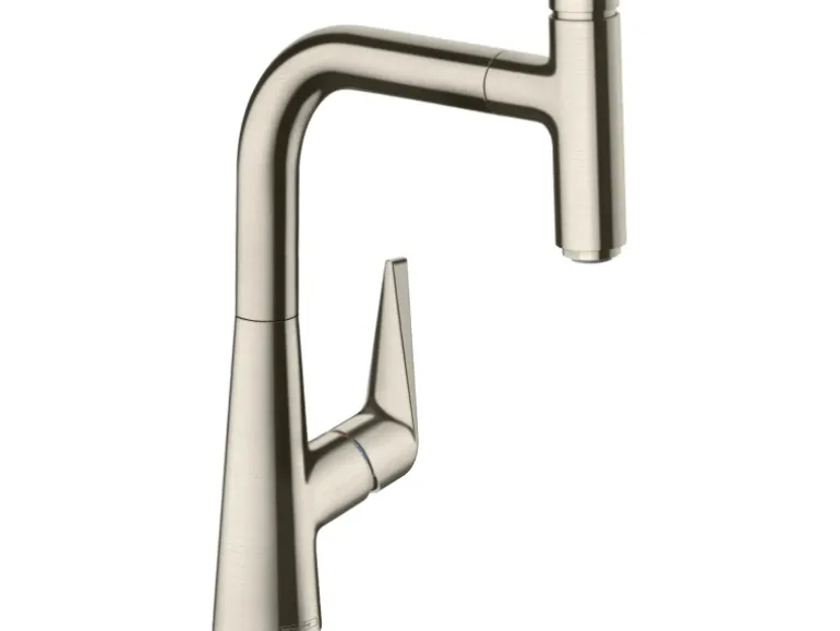 Hände voll? Für den Hansgrohe Talis Select Küchenmischer kein Problem. Starten und Stoppen Sie den Wasserfluss ganz einfach durch Drücken des Select-Knopfs. Das ist auch einfach mit dem Ellenbogen oder Handrücken möglich. Durch den Ausziehauslauf gelingt auch das Befüllen von Töpfen in geringer Entfernung ohne Probleme. Die MagFit Brausehalterung sorgt zusätzlich für eine einfache und nahezu geräuschlose Rückführung des Schlauchs. Der Auslauf fixiert sich wieder mittig im Küchenmischerauslauf.