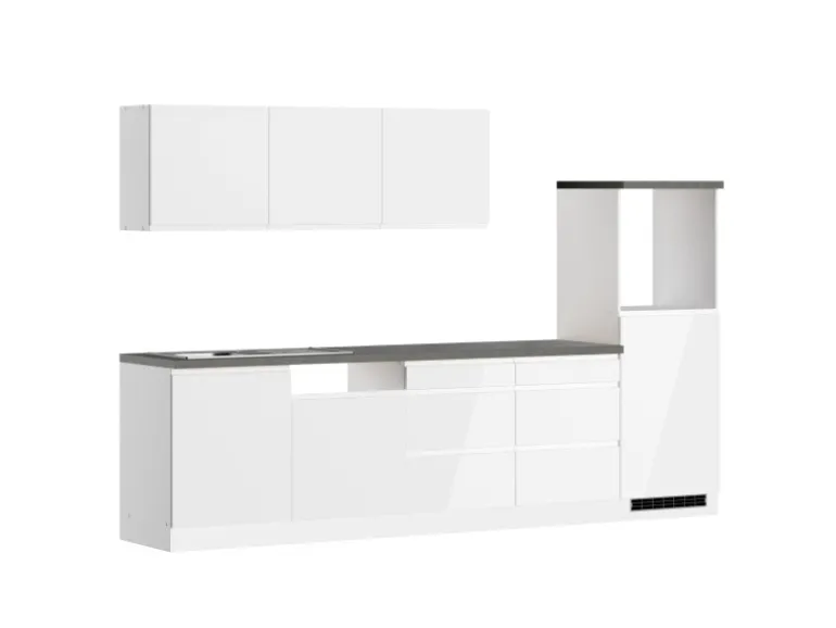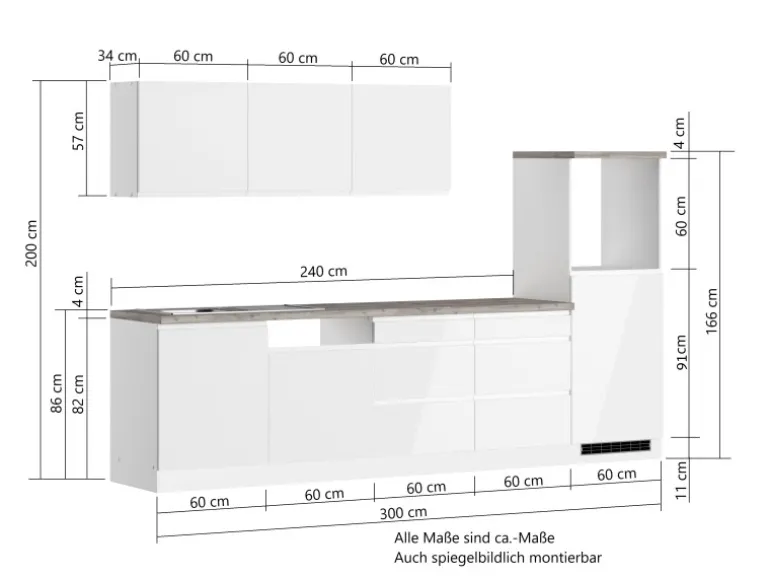 Die Küchenzeile wird Ihnen zerlegt und ohne Dekoration bis Bordsteinkante geliefert. Die Anordnung der Küchenelemente und die Anschläge der Türen sind somit für Sie frei wählbar. Die Arbeitsplatte wird ohne Ausschnitte geliefert. Technische Änderungen und Irrtümer vorbehalten