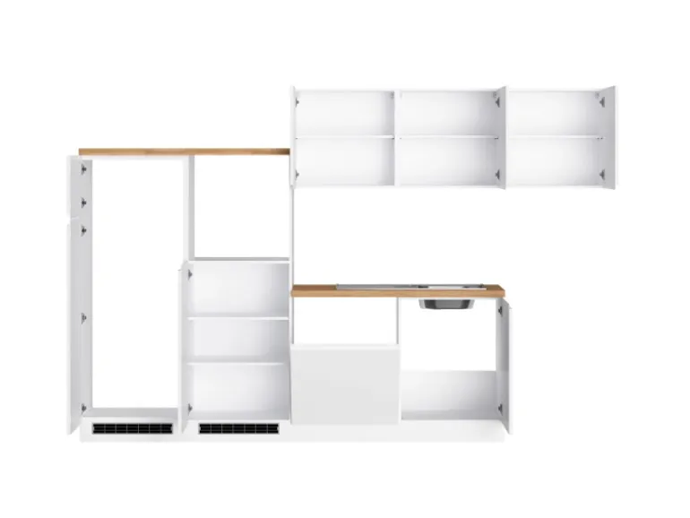 Die Küchenzeile wird Ihnen zerlegt und ohne Dekoration bis Bordsteinkante geliefert. Die Anordnung der Küchenelemente und die Anschläge der Türen sind somit für Sie frei wählbar. Die Arbeitsplatte wird ohne Ausschnitte geliefert. Technische Änderungen und Irrtümer vorbehalten