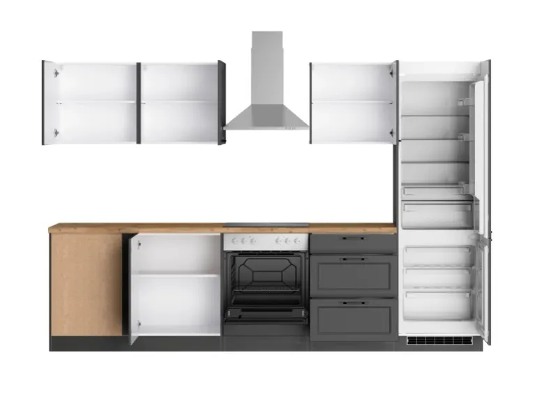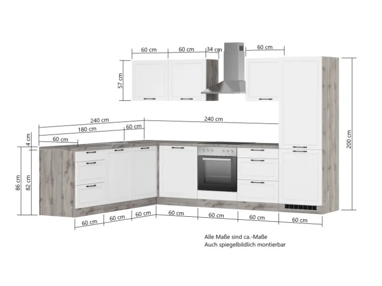 Die Küchenzeile wird Ihnen zerlegt und ohne Dekoration bis Bordsteinkante geliefert. Die Anordnung der Küchenelemente und die Anschläge der Türen sind somit für Sie frei wählbar. Die Arbeitsplatte wird ohne Ausschnitte geliefert. Technische Änderungen und Irrtümer vorbehalten