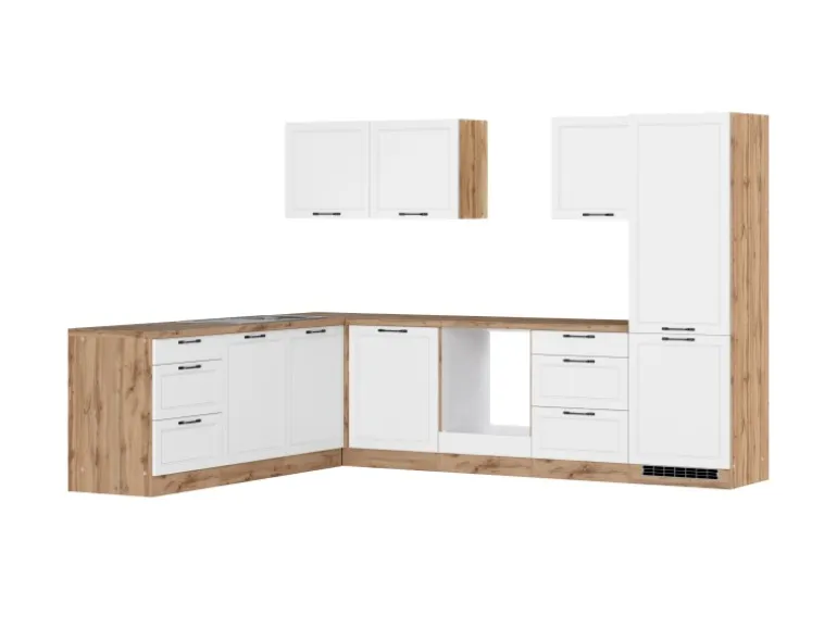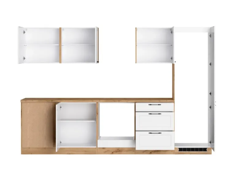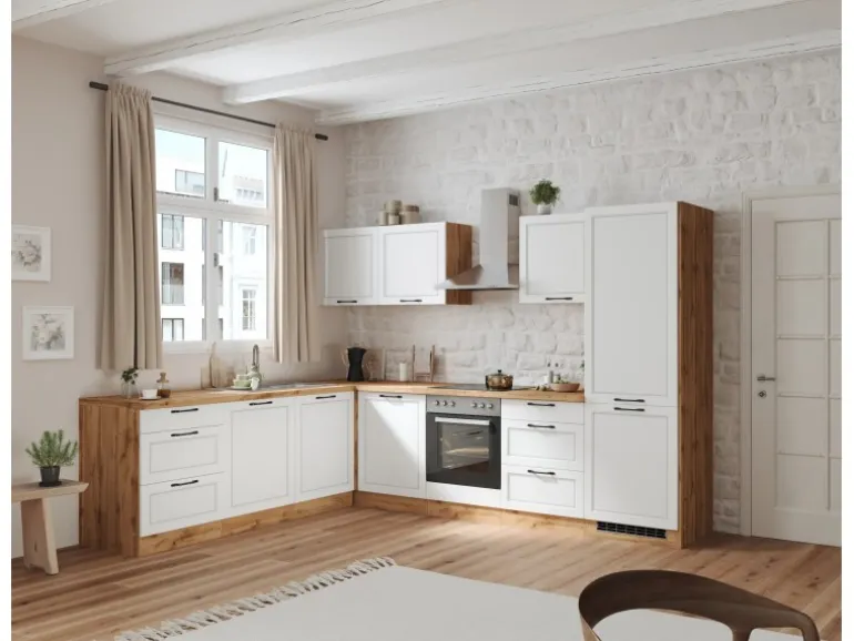 Die Küchenzeile wird Ihnen zerlegt und ohne Dekoration bis Bordsteinkante geliefert. Die Anordnung der Küchenelemente und die Anschläge der Türen sind somit für Sie frei wählbar. Die Arbeitsplatte wird ohne Ausschnitte geliefert. Technische Änderungen und Irrtümer vorbehalten