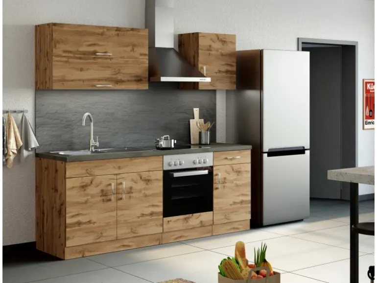 Die Küchenzeile wird Ihnen zerlegt und ohne Dekoration geliefert. Die Anordnung der Küchenelemente und die Anschläge der Türen sind somit für Sie frei wählbar. Die Arbeitsplatte wird ohne Ausschnitte geliefert. Technische Änderungen und Irrtümer vorbehalten