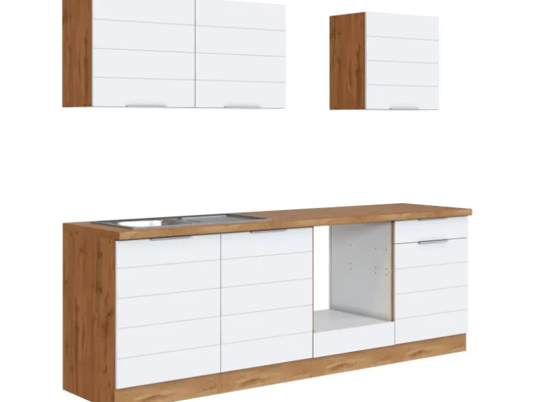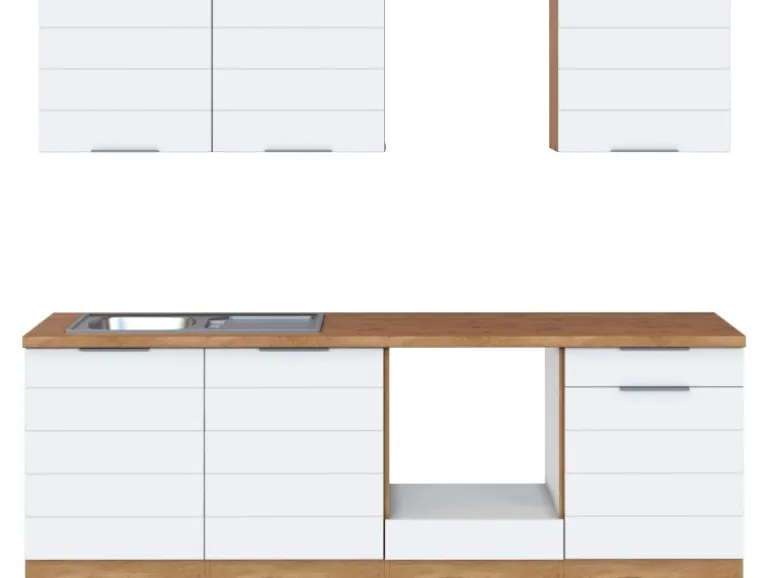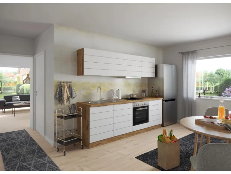 Die Küchenzeile wird Ihnen zerlegt und ohne Dekoration bis Bordsteinkante geliefert. Die Anordnung der Küchenelemente und die Anschläge der Türen sind somit für Sie frei wählbar. Die Arbeitsplatte wird ohne Ausschnitte geliefert. Technische Änderungen und Irrtümer vorbehalten