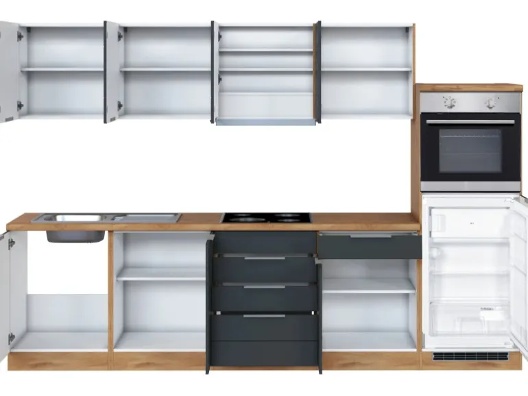 Die Küchenzeile wird Ihnen zerlegt und ohne Dekoration bis Bordsteinkante geliefert. Die Anordnung der Küchenelemente und die Anschläge der Türen sind somit für Sie frei wählbar. Die Arbeitsplatte wird ohne Ausschnitte geliefert. Technische Änderungen und Irrtümer vorbehalten