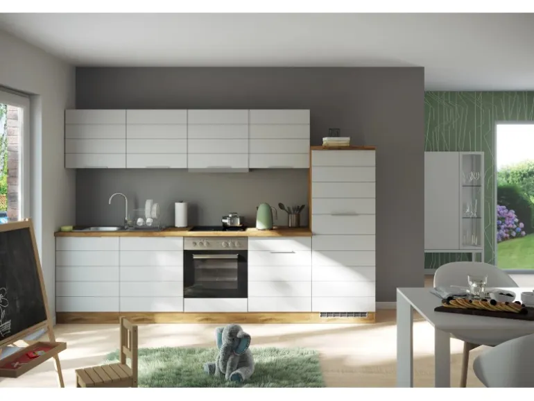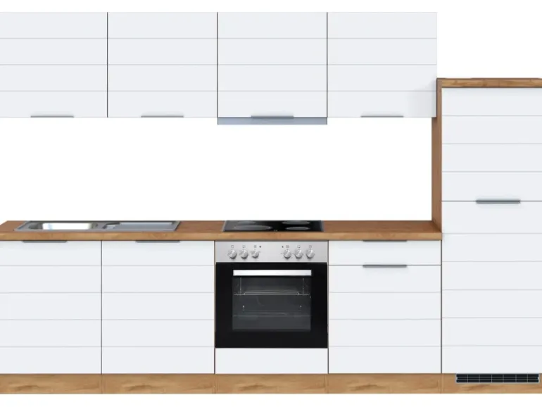 Die Küchenzeile wird Ihnen zerlegt und ohne Dekoration bis Bordsteinkante geliefert. Die Anordnung der Küchenelemente und die Anschläge der Türen sind somit für Sie frei wählbar. Die Arbeitsplatte wird ohne Ausschnitte geliefert. Technische Änderungen und Irrtümer vorbehalten