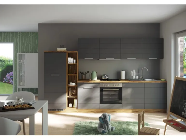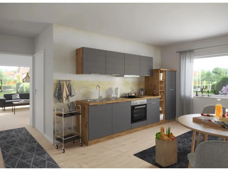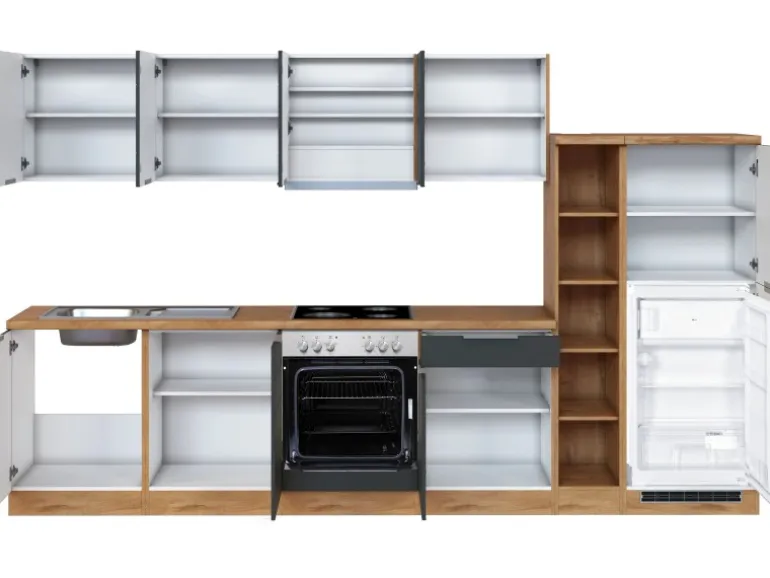 Die Küchenzeile wird Ihnen zerlegt und ohne Dekoration bis Bordsteinkante geliefert. Die Anordnung der Küchenelemente und die Anschläge der Türen sind somit für Sie frei wählbar. Die Arbeitsplatte wird ohne Ausschnitte geliefert. Technische Änderungen und Irrtümer vorbehalten