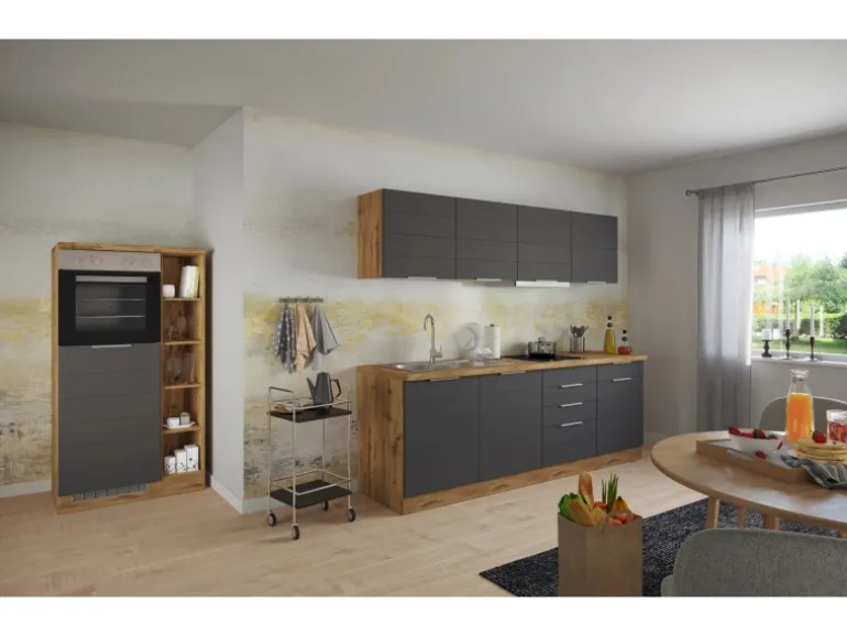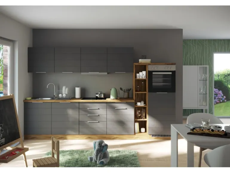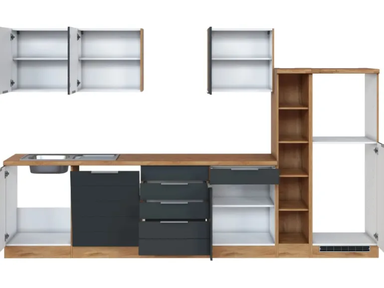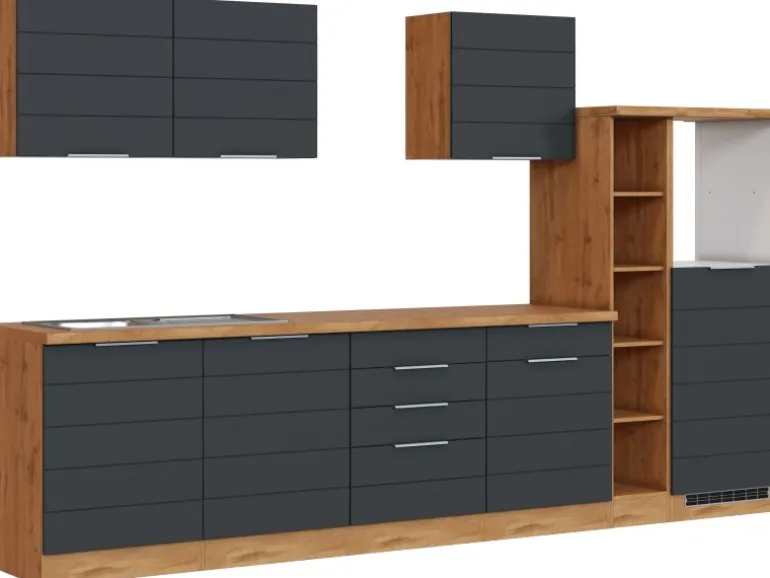 Die Küchenzeile wird Ihnen zerlegt und ohne Dekoration bis Bordsteinkante geliefert. Die Anordnung der Küchenelemente und die Anschläge der Türen sind somit für Sie frei wählbar. Die Arbeitsplatte wird ohne Ausschnitte geliefert. Technische Änderungen und Irrtümer vorbehalten