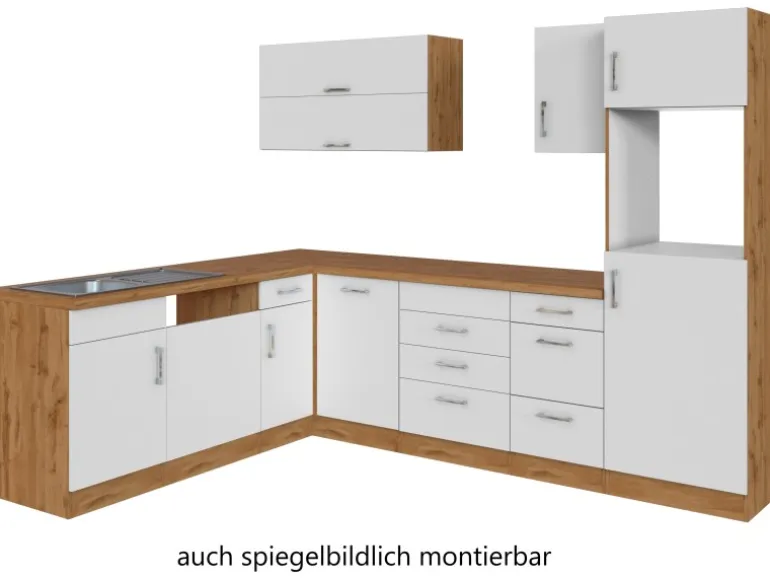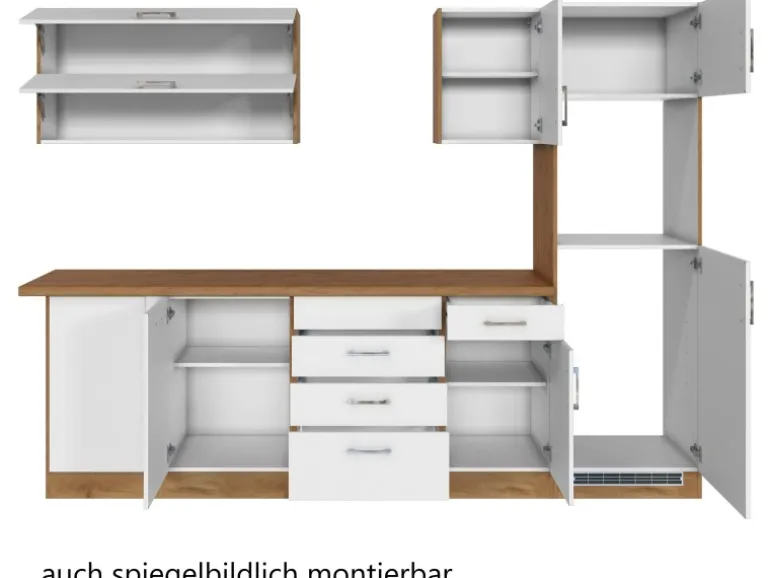 Die Küchenzeile wird Ihnen zerlegt und ohne Dekoration bis Bordsteinkante geliefert. Die Anordnung der Küchenelemente und die Anschläge der Türen sind somit für Sie frei wählbar. Die Arbeitsplatte wird ohne Ausschnitte geliefert. Technische Änderungen und Irrtümer vorbehalten