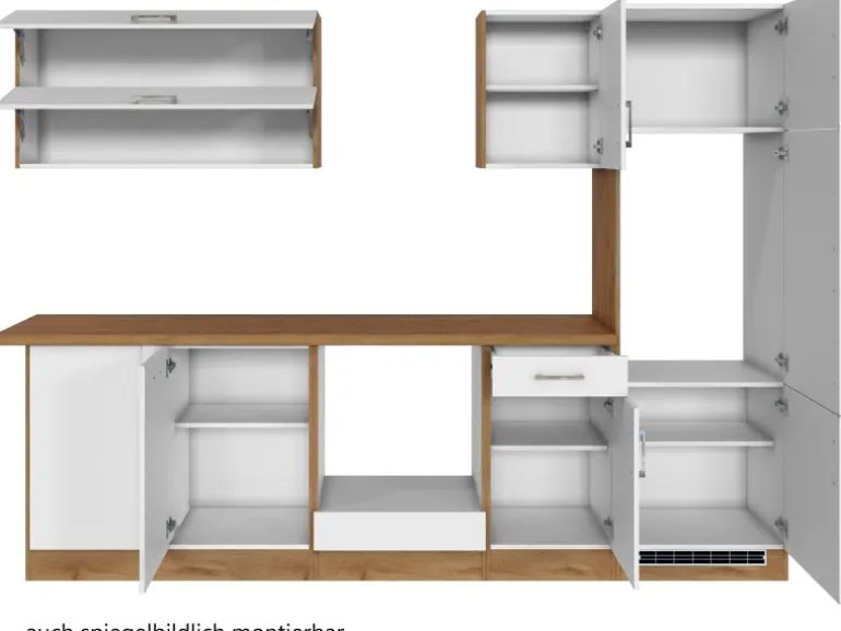 Die Küchenzeile wird Ihnen zerlegt und ohne Dekoration bis Bordsteinkante geliefert. Die Anordnung der Küchenelemente und die Anschläge der Türen sind somit für Sie frei wählbar. Die Arbeitsplatte wird ohne Ausschnitte geliefert. Technische Änderungen und Irrtümer vorbehalten