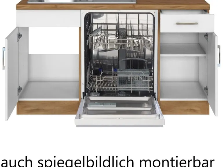 Die Küchenzeile wird Ihnen zerlegt und ohne Dekoration bis Bordsteinkante geliefert. Die Anordnung der Küchenelemente und die Anschläge der Türen sind somit für Sie frei wählbar. Die Arbeitsplatte wird ohne Ausschnitte geliefert. Technische Änderungen und Irrtümer vorbehalten