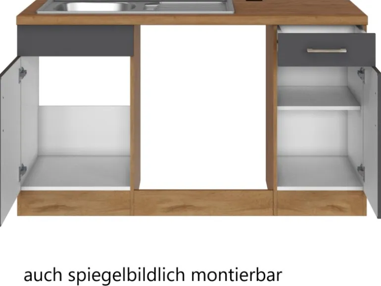 Die Küchenzeile wird Ihnen zerlegt und ohne Dekoration bis Bordsteinkante geliefert. Die Anordnung der Küchenelemente und die Anschläge der Türen sind somit für Sie frei wählbar. Die Arbeitsplatte wird ohne Ausschnitte geliefert. Technische Änderungen und Irrtümer vorbehalten