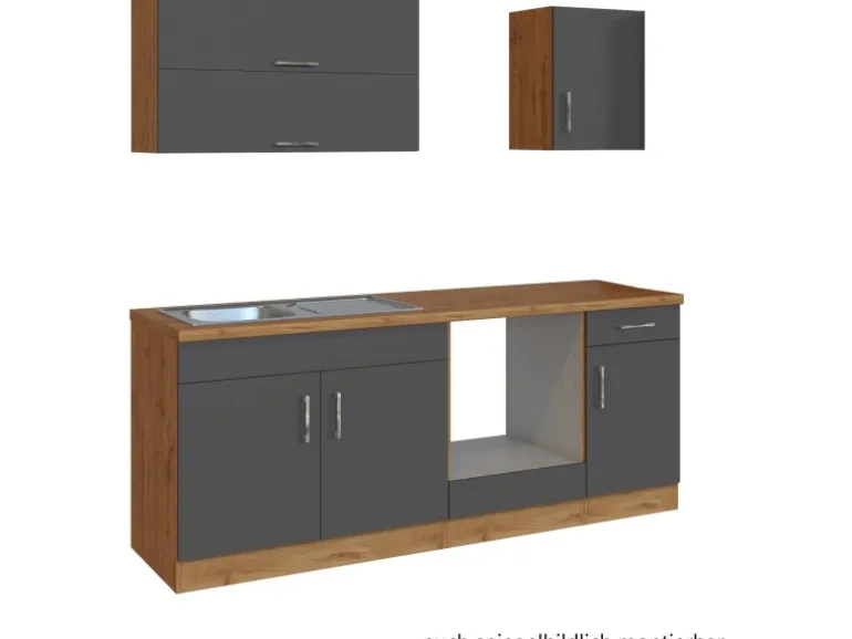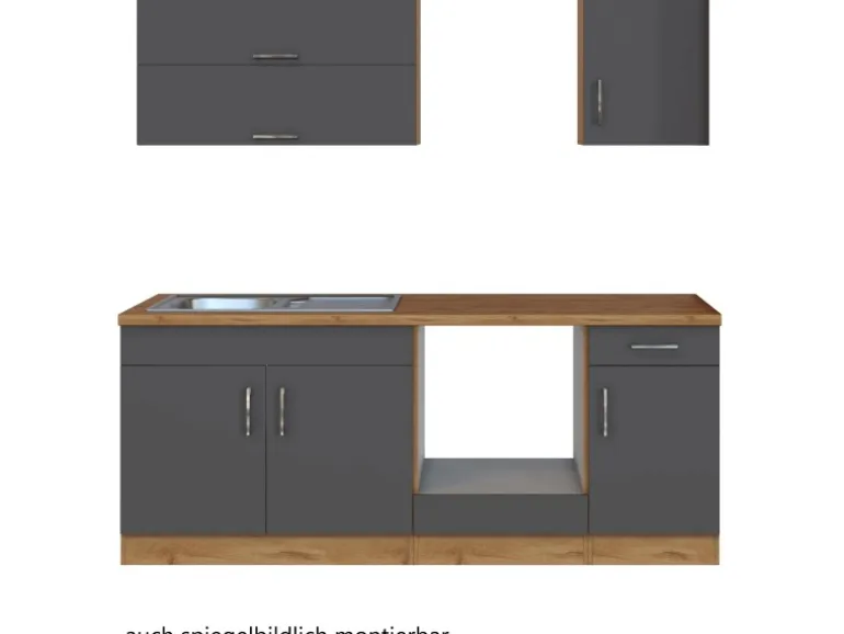 Die Küchenzeile wird Ihnen zerlegt und ohne Dekoration bis Bordsteinkante geliefert. Die Anordnung der Küchenelemente und die Anschläge der Türen sind somit für Sie frei wählbar. Die Arbeitsplatte wird ohne Ausschnitte geliefert. Technische Änderungen und Irrtümer vorbehalten