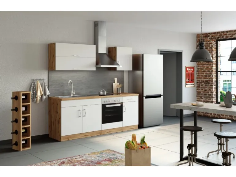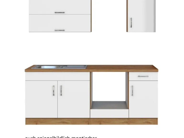 Die Küchenzeile wird Ihnen zerlegt und ohne Dekoration bis Bordsteinkante geliefert. Die Anordnung der Küchenelemente und die Anschläge der Türen sind somit für Sie frei wählbar. Die Arbeitsplatte wird ohne Ausschnitte geliefert. Technische Änderungen und Irrtümer vorbehalten