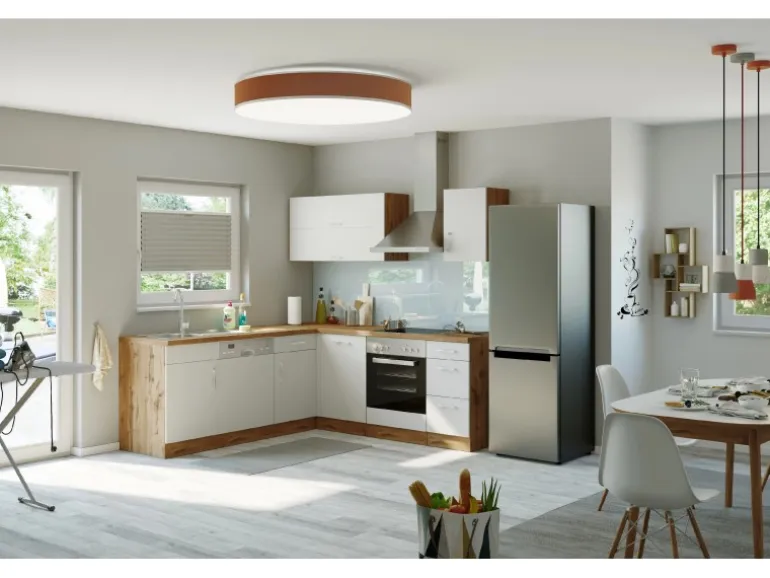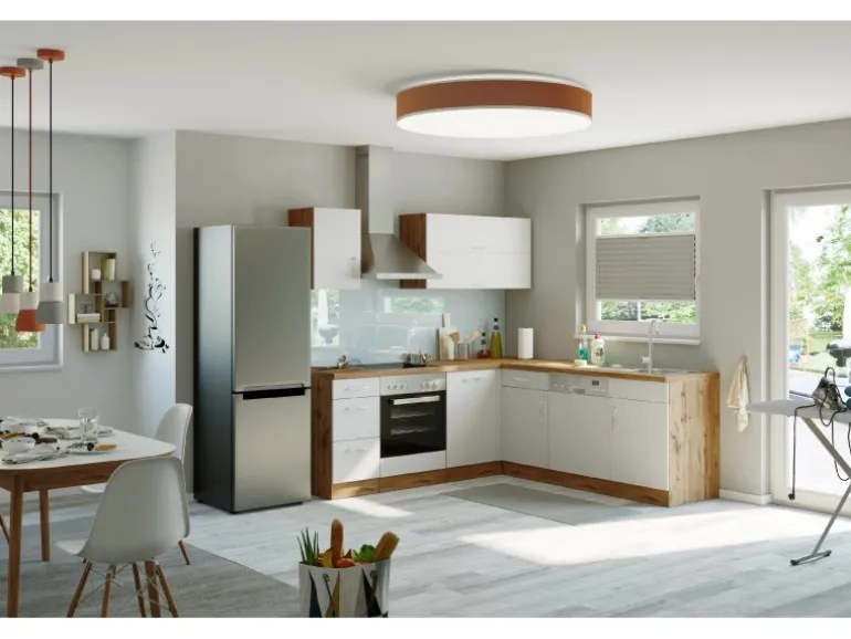 Die Küchenserie Sorrento besticht durch ihre 4 absolut trendstarken Dekorkombinationen, in denen immer das ausdrucksstarke Eichedekor eine entscheidende Rolle spielt. Durch eine Vielzahl an Zeilen- und Winkelkombinationen, die außerdem durch eine große Auswahl an Ergänzungsmöbeln komplettiert werden, ergibt sich ein breites Spektrum an Einrichtungsmöglichkeiten. Möchten Sie Ihren Backofen lieber autark in einem Hochschrank untergebracht haben? Benötigen Sie einen großzügigen Kühlschrank mit integriertem Gefrierschrank? Lagern Sie Ihre Vorräte gern in Auszügen und Apothekerschränken? Alle Schränke sind flexibel aufzustellen und die Türen sind wahlweise rechts oder links montierbar. Entscheiden Sie selbst- hier bleiben keine Wünsche offen.