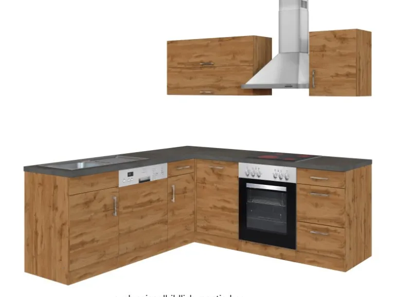 Die Küchenzeile wird Ihnen zerlegt und ohne Dekoration bis Bordsteinkante geliefert. Die Anordnung der Küchenelemente und die Anschläge der Türen sind somit für Sie frei wählbar. Die Arbeitsplatte wird ohne Ausschnitte geliefert. Technische Änderungen und Irrtümer vorbehalten