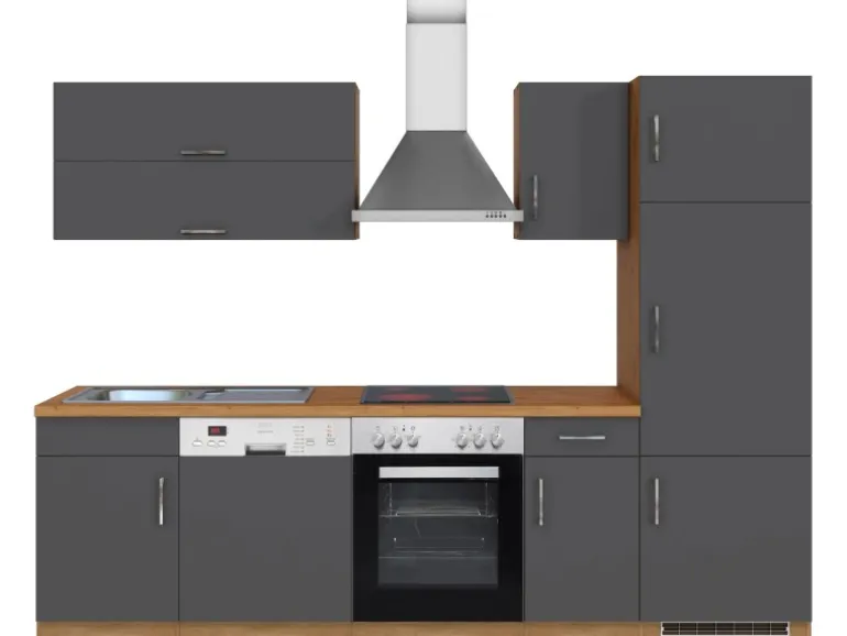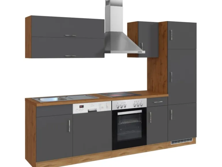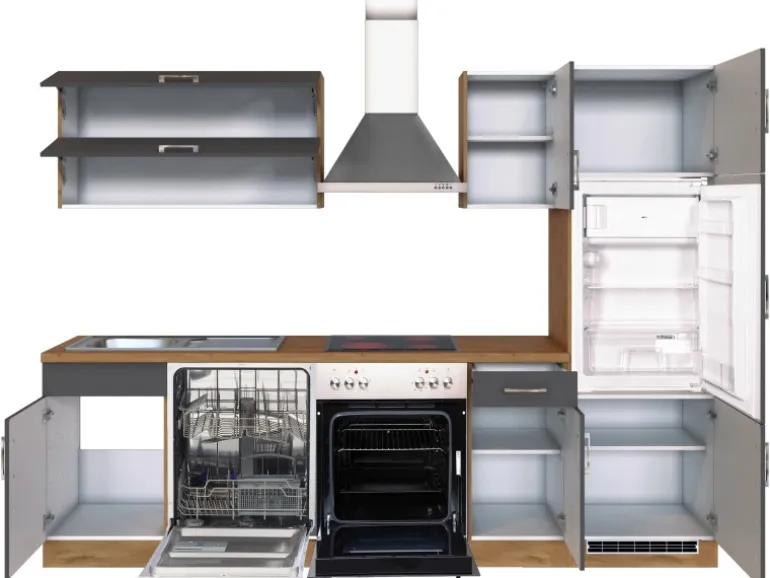 Die Küchenzeile wird Ihnen zerlegt und ohne Dekoration bis Bordsteinkante geliefert. Die Anordnung der Küchenelemente und die Anschläge der Türen sind somit für Sie frei wählbar. Die Arbeitsplatte wird ohne Ausschnitte geliefert. Technische Änderungen und Irrtümer vorbehalten