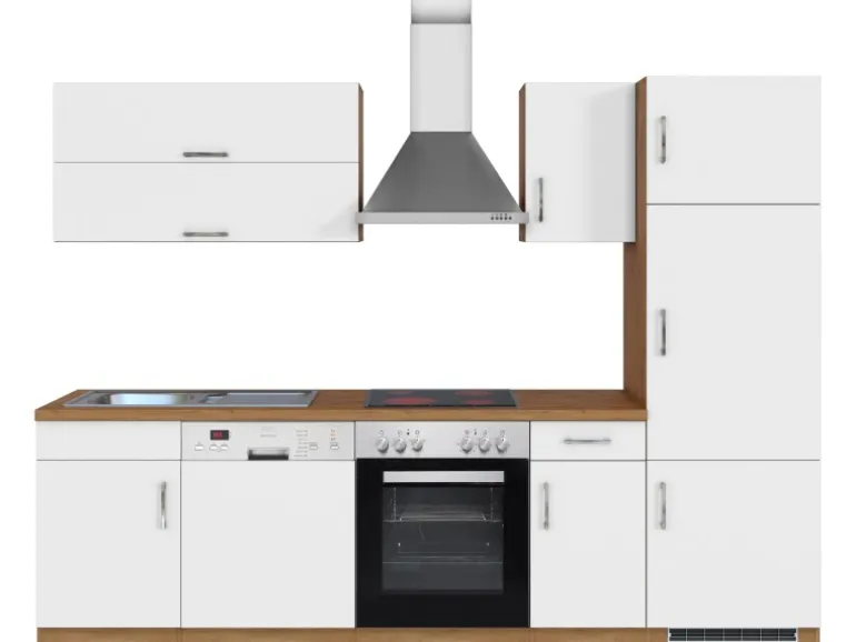 Die Küchenzeile wird Ihnen zerlegt und ohne Dekoration bis Bordsteinkante geliefert. Die Anordnung der Küchenelemente und die Anschläge der Türen sind somit für Sie frei wählbar. Die Arbeitsplatte wird ohne Ausschnitte geliefert. Technische Änderungen und Irrtümer vorbehalten