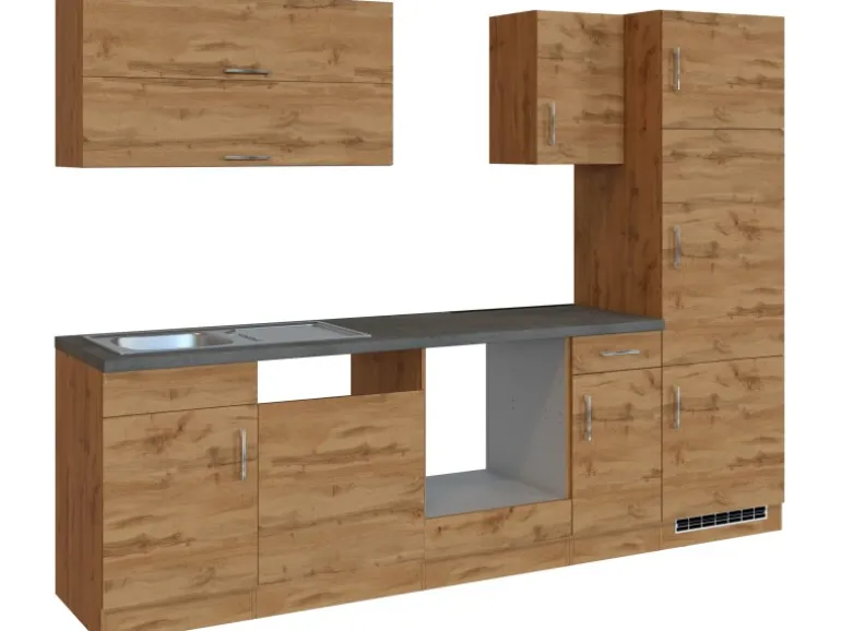 Die Küchenserie Sorrento besticht durch ihre 4 absolut trendstarken Dekorkombinationen, in denen immer das ausdrucksstarke Eichedekor eine entscheidende Rolle spielt. Durch eine Vielzahl an Zeilen- und Winkelkombinationen, die außerdem durch eine große Auswahl an Ergänzungsmöbeln komplettiert werden, ergibt sich ein breites Spektrum an Einrichtungsmöglichkeiten. Möchten Sie Ihren Backofen lieber autark in einem Hochschrank untergebracht haben? Benötigen Sie einen großzügigen Kühlschrank mit integriertem Gefrierschrank? Lagern Sie Ihre Vorräte gern in Auszügen und Apothekerschränken? Alle Schränke sind flexibel aufzustellen und die Türen sind wahlweise rechts oder links montierbar. Entscheiden Sie selbst- hier bleiben keine Wünsche offen.