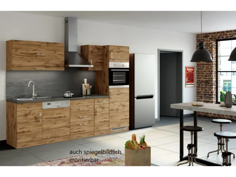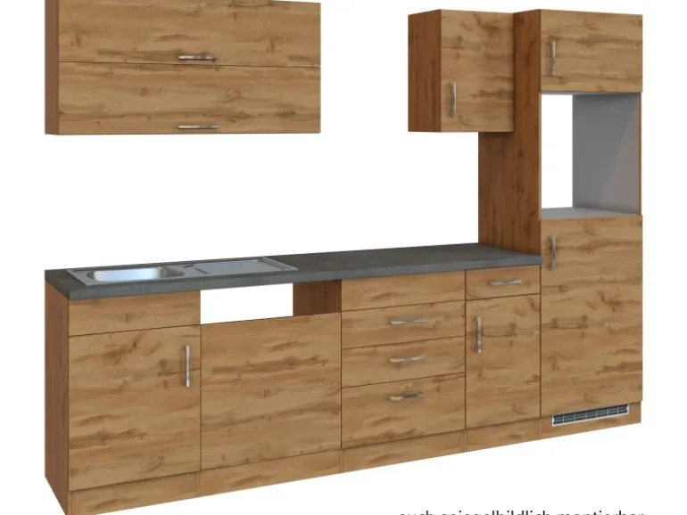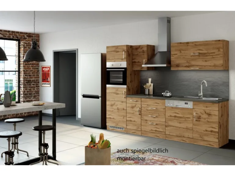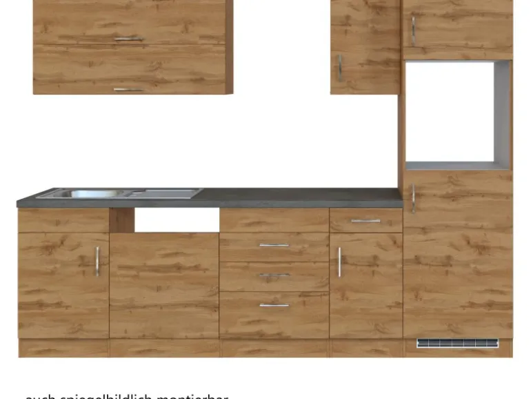 Die Küchenzeile wird Ihnen zerlegt und ohne Dekoration bis Bordsteinkante geliefert. Die Anordnung der Küchenelemente und die Anschläge der Türen sind somit für Sie frei wählbar. Die Arbeitsplatte wird ohne Ausschnitte geliefert. Technische Änderungen und Irrtümer vorbehalten