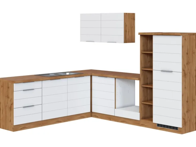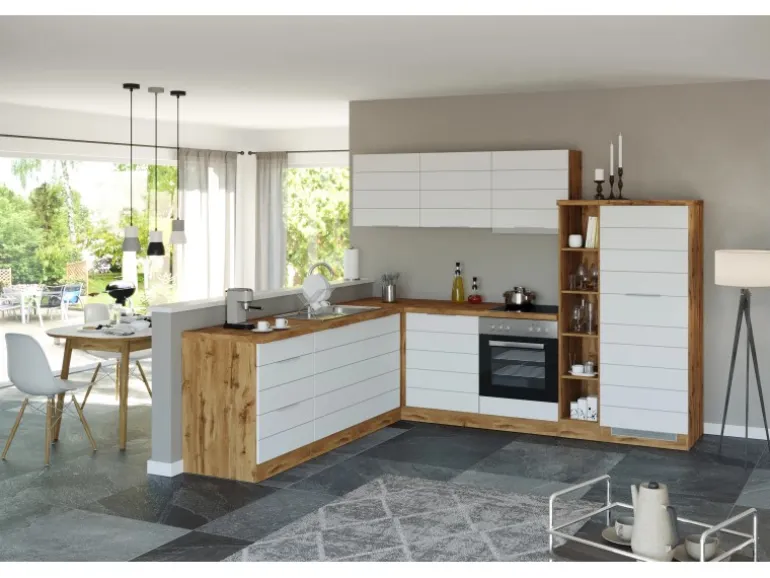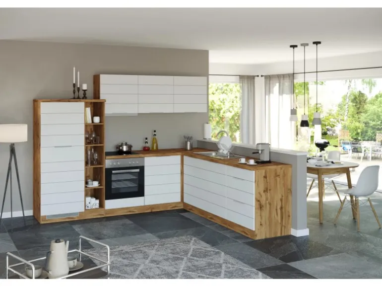 Die Küchenserie FLORENZ besticht durch ihre 2 absolut trendstarken Dekorkombinationen, in denen immer das ausdrucksstarke Wotan-Eichedekor eine entscheidende Rolle spielt. Elegante Metall-Griffleisten an hochwertigen MDF-Fronten mit Lisene in Mattweiß und Mattgrau werden mit einem ausdrucksstarken Eichedekor beim Korpus und der Arbeitsplatte kombiniert. So entsteht eine herausragende Optik, die genau den aktuellen Trend widerspiegelt. Eine Vielzahl an vordefinierten Zeilen und Winkel und verschiedenste Ergänzungsmöbel lassen keine Wünsche offen. In den Auszügen und hinter den Türen wird reichlich Stauraum für Küchenutensilien, Kochgeschirr und mehr geboten. Als Montagehilfe sind die einzelnen Schränke mit höhenverstellbaren Ausgleichsfüßen ausgestattet. Bestimmt werden Sie hier Ihre perfekte Küche finden!