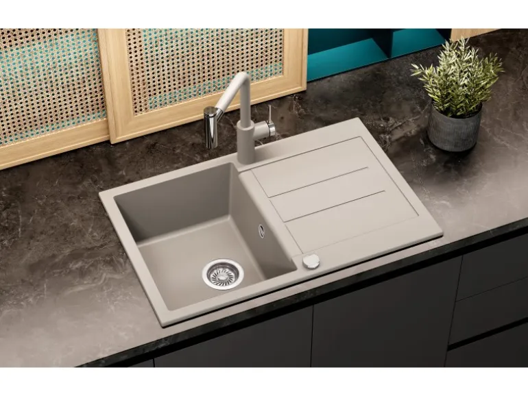 Helika Spülen werden aus natürlichem Quarzsand hergestellt, um einen hochwertigen Look und das Gefühl von echtem Stein zu bieten. Das Silicsana Granitmaterial besteht aus 80 % natürlichem Quarzsand und 20 % einzigartigem Kunstharz. Die Oberfläche der Spüle ist glatt, homogen und leicht zu reinigen.