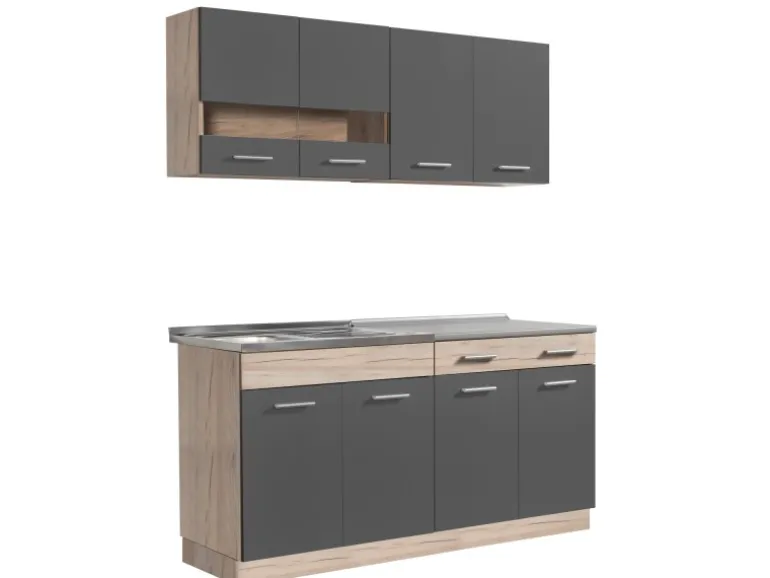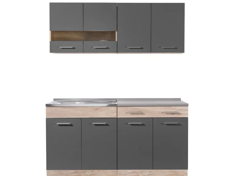 Die Einbauküche sorgt mit den Ober- und Unterschränken für viel Platz für Teller, Tassen, Gläser oder Töpfe. Eine Schublade bietet Stauraum für Besteck und weitere Kochutensilien. Der Küchenunterschrank wird mit einer robusten pflegeleichten Arbeitsplatte geliefert. Die Miniküche lässt sich durch zusätzliche Module aus unserem Sortiment erweitern.