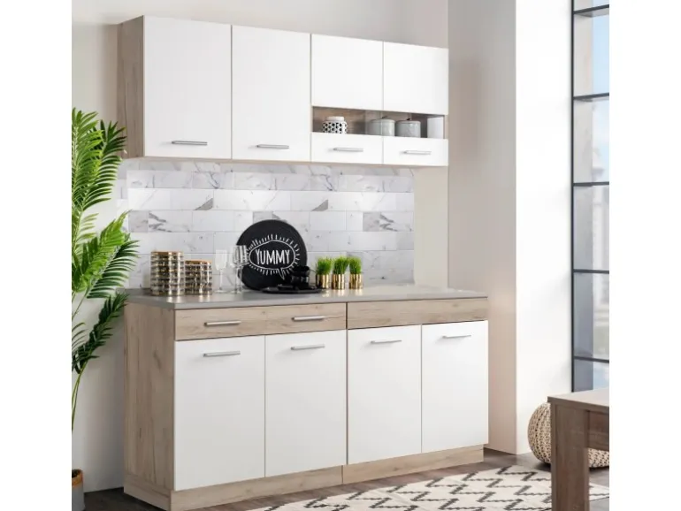 Küchenregale mit Arbeitsplatte im modernen, hochwertigen Design in Weiß und Eichenholzoptik