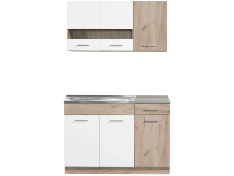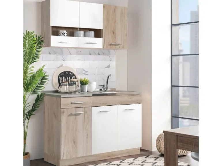 Die Einbauküche sorgt mit den Ober- und Unterschränken für viel Platz für Teller, Tassen, Gläser oder Töpfe. Eine Schublade bietet Stauraum für Besteck und weitere Kochutensilien. Der Küchenunterschrank wird mit einer robusten pflegeleichten Arbeitsplatte geliefert. Die Miniküche lässt sich durch zusätzliche Module aus unserem Sortiment erweitern.