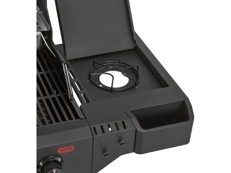 Die Seitentische dieses Jamestown Gasgrills sind wahre Multifunktionstalente. Sie bieten nicht nur einen gasbetriebenen Seitenbrenner, der sich ideal als zusätzliche Kochstelle für Beilagen oder Soßen eignet, sondern auch zwei integrierte Edelstahlbehälter. Nutze diese Behälter für die hygienische Aufbewahrung von mariniertem Fleisch, Gemüse oder Zubehör. Ein praktisches Bambus-Schneidebrett ist ebenfalls inklusive und macht die Vorbereitung direkt am Grill besonders komfortabel. Die Gesamtmaße des Grills betragen (H x B x T): 118 cm x 144 cm x 56 cm.