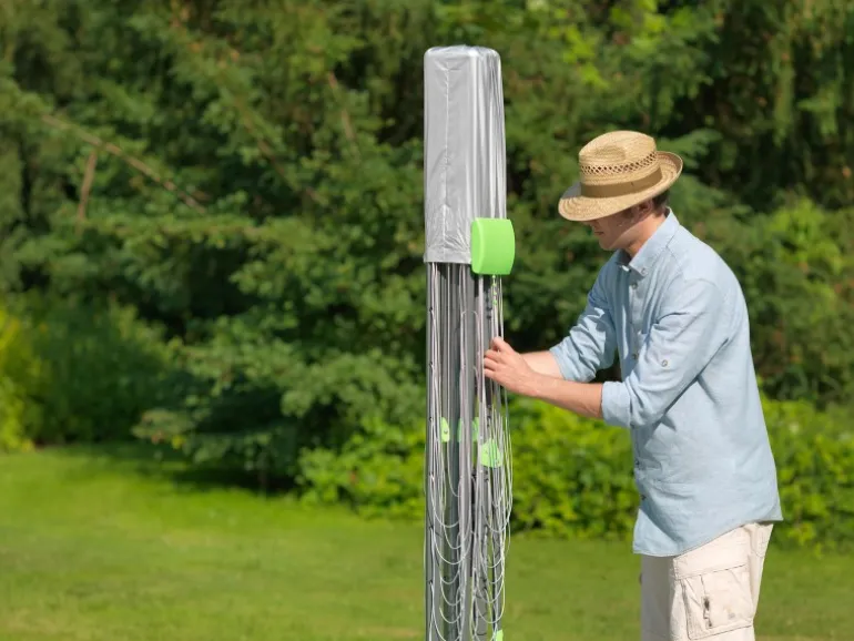 Das Verschmutzen der Wäschespinne wird durch die praktische Schutzhüllen-Automatik verhindert. Sobald Sie den Wäscheschirm zusammenklappen, umhüllt der Schutz die Leinen und beugt dem Eindringen von Feuchtigkeit vor. Die Wäschespinne ist sehr robust und witterungs- sowie UV-beständig, wodurch keine Schäden entstehen, sollten Sie das Zusammenklappen einmal vergessen. Für Robustheit im Stand ist durch das 50 mm dicke Aluminium-Stahlrohr ebenfalls gesorgt.