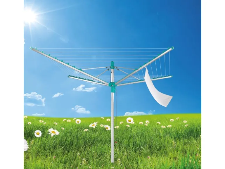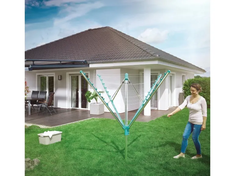 Mit 40 m Leinenlänge bietet die Wäschespinne viel Platz für die gesamte Wäsche Ihres Haushalts. Insgesamt lassen sich bis zu vier Waschmaschinenfüllungen aufhängen – auch große Wäschestücke wie Betttücher, Tischdecken und Badehandtücher. Alle eingesetzten Materialien sind witterungs- und UV-beständig. Eine Bodenhülse zum Einbetonieren der Wäschespinne ist inklusive.