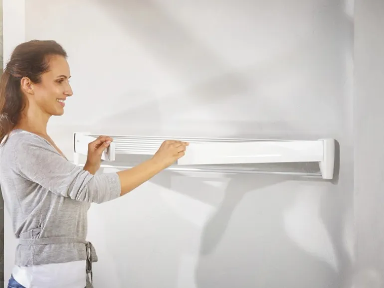 Der Wäscheaufhänger bietet eine perfekte Lösung für kleine Badezimmer und Balkons und steht bei Nichtgebrauch nicht im Weg herum. Der Wandtrockner lässt sich bei Bedarf einfach ausziehen und danach einfach wieder platzsparend zusammenschieben. Gleichzeitig sind die Trockenstäbe vor Schmutz und Regen geschützt.