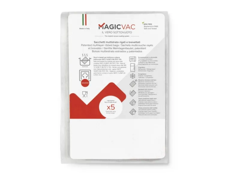 Die Magic Vac Vakuumierbeutel sind nicht nur für die Aufbewahrung von Lebensmitteln geeignet, sondern auch für das Kochen im Wasserbad oder Dampfofen. Sie sind BPA-frei und somit sicher im Kontakt mit Lebensmitteln. Außerdem sind sie wiederverwendbar und waschbar. Die patentierte Folie mit einer besonderen Dicke von 0,24 mm und einer speziellen Mehrschicht-Struktur bietet herausragenden Schutz und Haltbarkeit für empfindliche sowie spitze Inhalte.