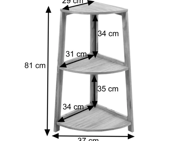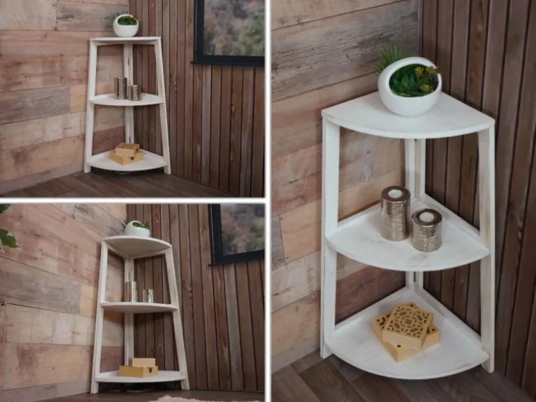 Dieses Regal bietet mit seinen drei Ablagen ausreichend Stauraum für verschiedene Utensilien wie Bücher, Dekorationsartikel, Pflanzen oder andere persönliche Gegenstände. Aufgrund seines Eckdesigns eignet es sich gut, um ungenutzten Raum in einer Ecke zu nutzen und gleichzeitig einen dekorativen Akzent im Raum zu setzen. Egal ob im Bad, Kinderzimmer, Flur oder Küche, es macht überall eine gute Figur. Durch das zeitlose und moderne Design fügt sich dieses Eckregal dekorativ in fast jedes Ambiente ein.