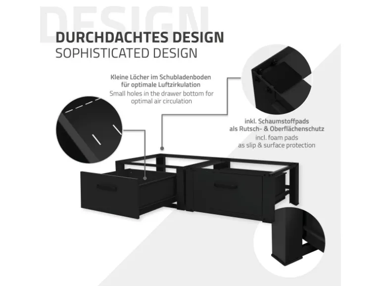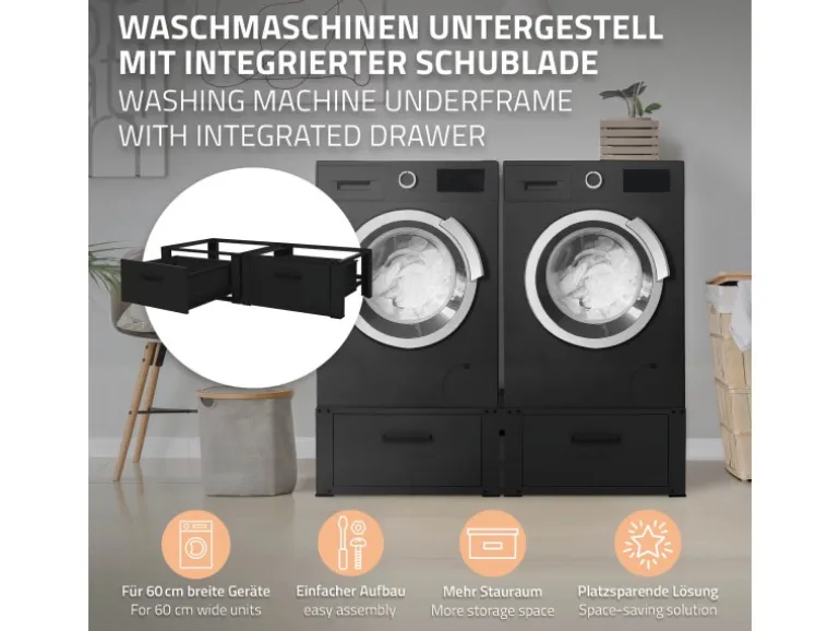 Erhöhe deine Waschmaschine und Trockner auf eine ergonomische Arbeitshöhe von 31,5 cm und entlaste deinen Rücken mit unserem stabilem Doppel Waschmaschinen-Untergestell. Die robuste Konstruktion sorgt für einen festen Stand und die praktische Ablagefläche bietet eine praktische Lösung für dein Wäschezubehör. Dank der Schubladen hast du jederzeit Zugriff auf deine Wäscherei-Accessoires. Die Schubalden sind aus Stahl und hat einen Griff aus Aluminium. Perfekt für kleine Räume ist unser Doppel Waschmaschinen-Untergestell eine smarte Lösung, um Platz zu sparen und deine Wäschepflege zu erleichtern.
