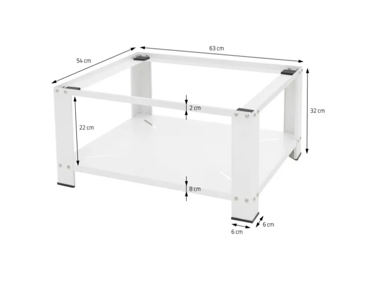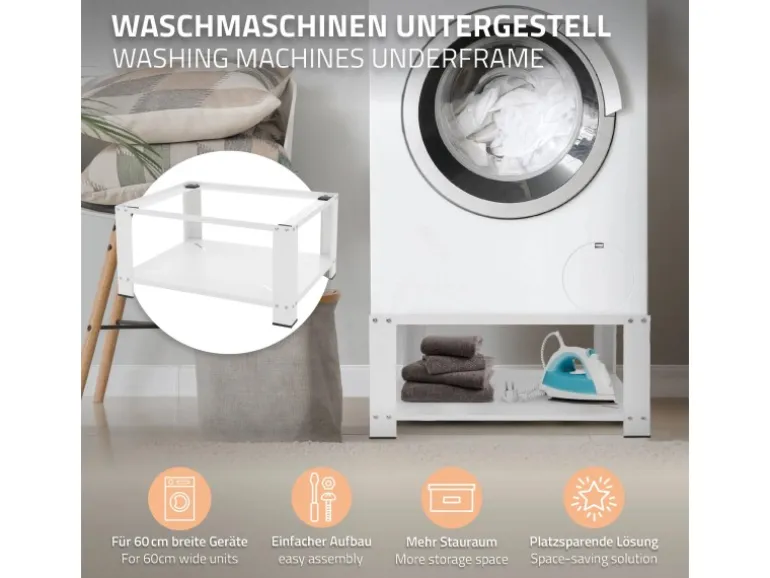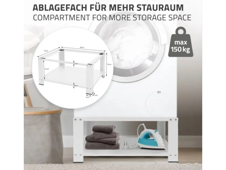 Erhöhe deine Waschmaschine und Trockner auf eine ergonomische Arbeitshöhe von 32 cm mit unserem stabilem Waschmaschinen-Untergestell. Mit einem Ablagefach kannst du Waschmittel, Weichspüler und andere Wäschezubehör praktisch und bequem aufbewahren. Mit einem Zwischenfach von 22 cm, der Platz in der untersten Position ist ausreichend Stauraum vorhanden. Verwende das Untergestell auch als praktischen Waschmaschinen-Unterschrank und schütze deine Maschine vor Bodennässe. Es ist für alle gängigen Waschmaschinen und Trocknern geeignet und erleichtert das Ein- und Ausladen enorm. Das Beladen wird dadurch sehr komfortabel. Der Rahmen verhindert dabei das Runterfallen des Geräts vom Podest. Die Füße mit Gummiaufsätzen sorgen für einen festen Stand ohne Verrutschen und mildern Vibrationen, um Kratzer auf dem Boden zu vermeiden. Im Lieferumfang enthalten ist 1x Waschmaschinen-Sockel mit 150 kg Traglast, Montagematerial und eine Bedienungsanleitung.