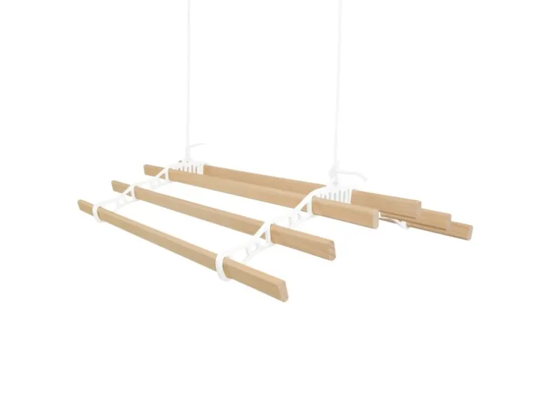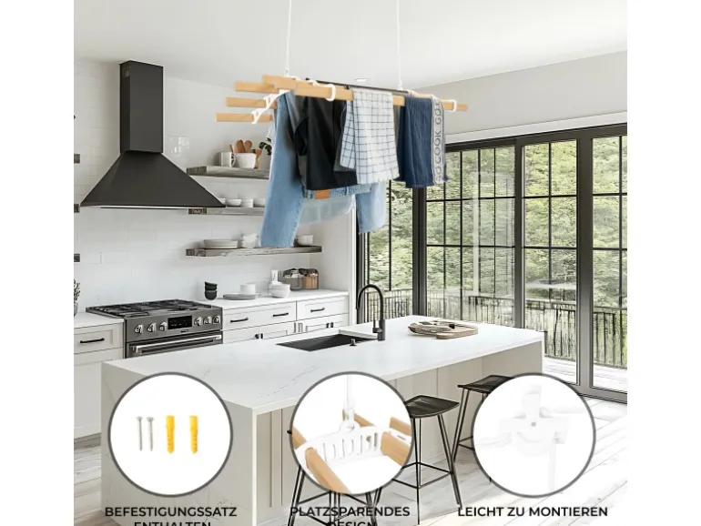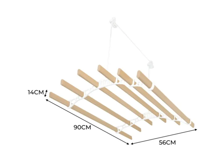 Entdecken Sie eine intelligentere und elegantere Art, Ihre Wäsche zu trocknen, mit unserem 0,9 m langen, weißfarbenen und 6-Latten-Decken-Wäscheständer. Perfekt für alle, die Wert auf Funktionalität und Stil legen. Diese platzsparende Lösung ermöglicht es Ihnen, Ihre Kleidung auf natürliche Weise zu trocknen und Ihrem Zuhause gleichzeitig einen Hauch von traditionellem Charme zu verleihen. Egal, ob Sie nach eineren Alternative zu Wäschetrocknern suchen oder einfach nur Ihren Wohnraum maximieren möchten, dieser Wäscheständer ist genau das Richtige für Sie. Der auf Langlebigkeit ausgelegte Wäscheständer verfügt über sechs Latten aus lackiertem Kiefernholz mit einer Länge von jeweils 90 cm und bietet großzügigen Platz für große Wäscheladungen, Handtücher oder Bettwäsche. Das robuste Flaschenzugsystem ist einfach zu bedienen und für das mühelose Heben schwerer Gegenstände konzipiert. Ausgestattet mit robusten, pulverbeschichteten Eisengestellenden und Halterungen in einem eleganten Weißton wertet dieser Wäscheständer nicht nur Ihren Raum auf, sondern sorgt auch für dauerhafte Haltbarkeit. Die mitgelieferten Befestigungselemente machen den Aufbau zum Kinderspiel und ermöglichen Ihnen die einfache Montage des Wäscheständers an den meisten Deckentypen, auch an geneigten Decken, für eine vielseitige und bequeme Nutzung. Mit seiner Mischung aus zeitlosem Design und praktischen Funktionen ist dieser Decken-Wäscheständer eine wunderbare Ergänzung für jedes Zuhause. Genießen Sie die Vorteile des natürlichen Trocknens und verleihen Sie Ihrem Raum gleichzeitig einen Hauch von Charme, sodass der Waschtag noch angenehmer wird. Produktmerkmale: * Hochwertiges lackiertes Kiefernholz und weißfarbenes Gusseisen * Traditionelles und praktisches Flaschenzugsystem-Design * Guter Fraberaum mit 6 Latten * Vereinbar mit flachen und geneigten Decken * Einfache Installation mit KOSTENLOSEM Befestigungssatz Spezifikationen: * Farbe: Weiß * Gewicht: 3.3kg * Lattenmaterial: Lackierte Kiefer aus ethisch einwandfreiem Anbau * Material des Rach-Endes: Pulverbeschichtetes Gusseisen * Seilmaterial: Baumwolle * Höhe: 140mm / 14cm * Breite: 560mm / 56cm * Tiefe: 900mm / 90cm * Lücke zwischen Latten: 800mm / 80cm * Seillänge: 10 m * Gewichtskapazität: 30 kg Im Lieferumfang enthalten: * 1 x stabiler Wäscheständer * 1 x sicheres Befestigungsset