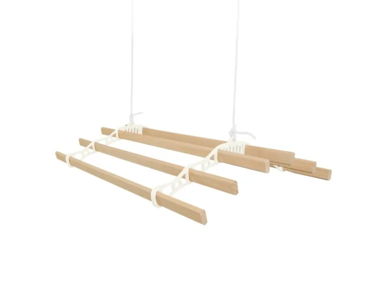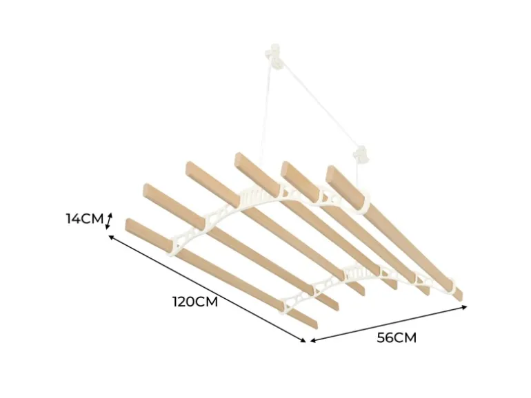 Entdecken Sie eine intelligentere und elegantere Art, Ihre Wäsche zu trocknen, mit unserem 1,2 m langen, elfenbeinfarbenen und 6-Latten-Decken-Wäscheständer. Perfekt für alle, die Wert auf Funktionalität und Stil legen. Diese platzsparende Lösung ermöglicht es Ihnen, Ihre Kleidung auf natürliche Weise zu trocknen und Ihrem Zuhause gleichzeitig einen Hauch von traditionellem Charme zu verleihen. Egal, ob Sie nach eineren Alternative zu Wäschetrocknern suchen oder einfach nur Ihren Wohnraum maximieren möchten, dieser Wäscheständer ist genau das Richtige für Sie. Der auf Langlebigkeit ausgelegte Wäscheständer verfügt über sechs Latten aus lackiertem Kiefernholz mit einer Länge von jeweils 120 cm und bietet großzügigen Platz für große Wäscheladungen, Handtücher oder Bettwäsche. Das robuste Flaschenzugsystem ist einfach zu bedienen und für das mühelose Heben schwerer Gegenstände konzipiert. Ausgestattet mit robusten, pulverbeschichteten Eisengestellenden und Halterungen in einem eleganten Elfenbeinton wertet dieser Wäscheständer nicht nur Ihren Raum auf, sondern sorgt auch für dauerhafte Haltbarkeit. Die mitgelieferten Befestigungselemente machen den Aufbau zum Kinderspiel und ermöglichen Ihnen die einfache Montage des Wäscheständers an den meisten Deckentypen, auch an geneigten Decken, für eine vielseitige und bequeme Nutzung. Mit seiner Mischung aus zeitlosem Design und praktischen Funktionen ist dieser Decken-Wäscheständer eine wunderbare Ergänzung für jedes Zuhause. Genießen Sie die Vorteile des natürlichen Trocknens und verleihen Sie Ihrem Raum gleichzeitig einen Hauch von Charme, sodass der Waschtag noch angenehmer wird. Produktmerkmale: * Hochwertiges lackiertes Kiefernholz und elfenbeinfarbenes Gusseisen * Traditionelles und praktisches Flaschenzugsystem-Design * Guter Fraberaum mit 6 Latten * Vereinbar mit flachen und geneigten Decken * Einfache Installation mit KOSTENLOSEM Befestigungssatz Spezifikationen: * Farbe: Elfenbein * Gewicht: 3.7kg * Lattenmaterial: Lackierte Kiefer aus ethisch einwandfreiem Anbau * Material des Rach-Endes: Pulverbeschichtetes Gusseisen * Seilmaterial: Baumwolle * Höhe: 140mm / 14cm * Breite: 560mm / 56cm * Tiefe: 1200mm / 120cm * Lücke zwischen Latten: 1000mm / 100cm * Seillänge: 10 m * Gewichtskapazität: 30 kg Im Lieferumfang enthalten: * 1 x stabiler Wäscheständer * 1 x sicheres Befestigungsset