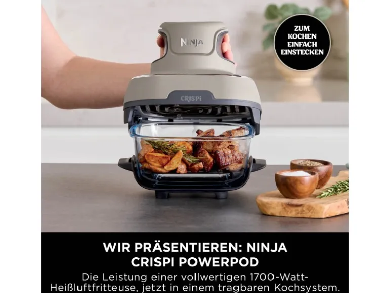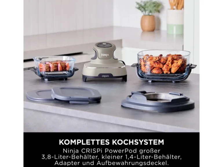 Wechsle zwischen dem großen 3,8 l Behälter und dem kleinen 1,4 l Behälter für kleinere Portionen. Bereite eine Mahlzeit in unter 15 Minuten zu oder koche ein ganzes 1,2 kg Hähnchen mit Gemüse. Der PowerPod CRISPi erkennt den Behälter automatisch und passt die Temperatur an. Damit eignet sich das System perfekt für kleine oder große Portionen, Meal-Prepping, Snacks, Partygerichte und vieles mehr.
