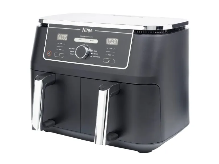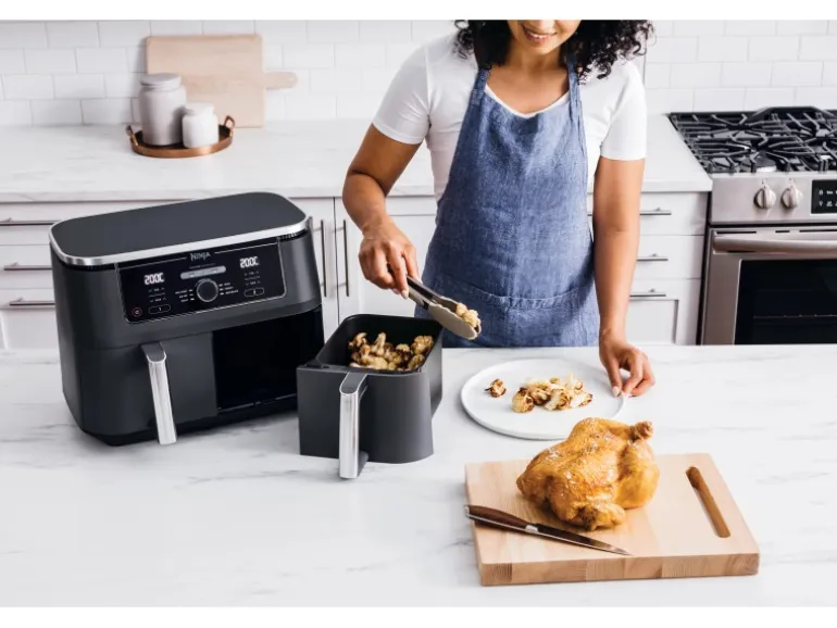 Ideal für Familien und große Haushalte: Diese extra große Heißluftfritteuse gart bis zu 25 % mehr. Machen Sie mühelos 8 oder mehr Personen satt, oder bereiten Sie einfach genug für sich selbst zu. In jedes 4,75 l Fach passt ein 2 kg schweres Hähnchen oder bis zu 1,4 kg Pommes frites, das heißt, Sie können mühelos eine komplette Mahlzeit aus einem ganzen Brathähnchen und knusprigen, heißluftfrittierten Pommes kreieren, die in einem Gerät gegart und auf den Punkt verzehrbereit ist.