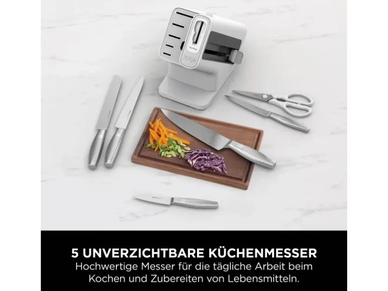 Mit diesem 6-teiligen Messerset bist du für die alltäglichen Aufgaben in der Küche bestens ausgestattet. Es enthält 5 Küchenmesser und eine robuste Küchenschere. Der Messerblock hilft dir außerdem, deine Messer zu schützen und auf deiner Arbeitsfläche aufzubewahren. Es wird empfohlen, die Messer alle zwei Wochen oder wenn sie sich unscharf anfühlen, zu schärfen. Der eingebaute Schleifer enthält ein Schleifrad aus Stein, das exklusiv für Ninja-Messer entwickelt wurde.