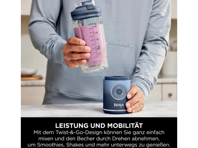 Zwei automatische Auto-iQ-Programme zerkleinern und verarbeiten Zutaten in Sekundenschnelle. Durch einfaches Drehen können Sie den Mixbecher und den auslaufsicheren Deckel entfernen – ideal zum Trinken unterwegs, während einer Fitnesseinheit oder bei einem Outdoor-Abenteuer. Und sein trendiges Finish in Blau bedeutet: Mixen mit Stil.