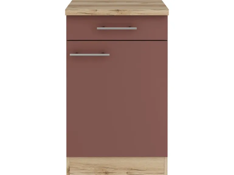 Die Serie Bari407 ist mit der Kombination aus Frontfarbe in Rostrot mit Korpus und Arbeitsplatte in Wildeiche Nachbildung perfekt abgestimmt. Metallgriffe in Edelstahl-Optik runden den Look ab und machen Ihre Küche zu einem echten Hingucker.