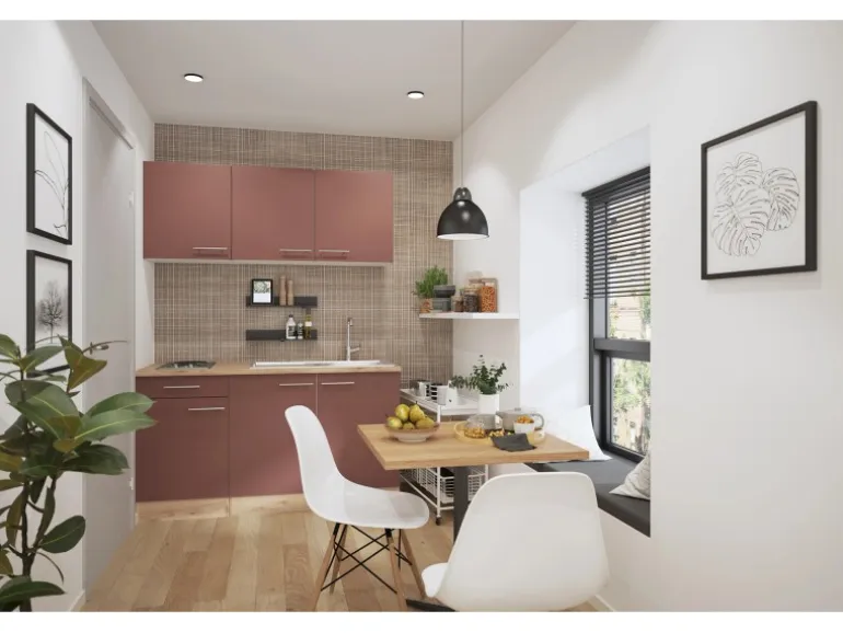 Die Serie Bari407 ist mit der Kombination aus Frontfarbe in Rostrot mit Korpus und Arbeitsplatte in Wildeiche Nachbildung perfekt abgestimmt. Metallgriffe in Edelstahl-Optik runden den Look ab und machen auch den kleinsten Raum mit dieser Küche zu einem Hingucker.