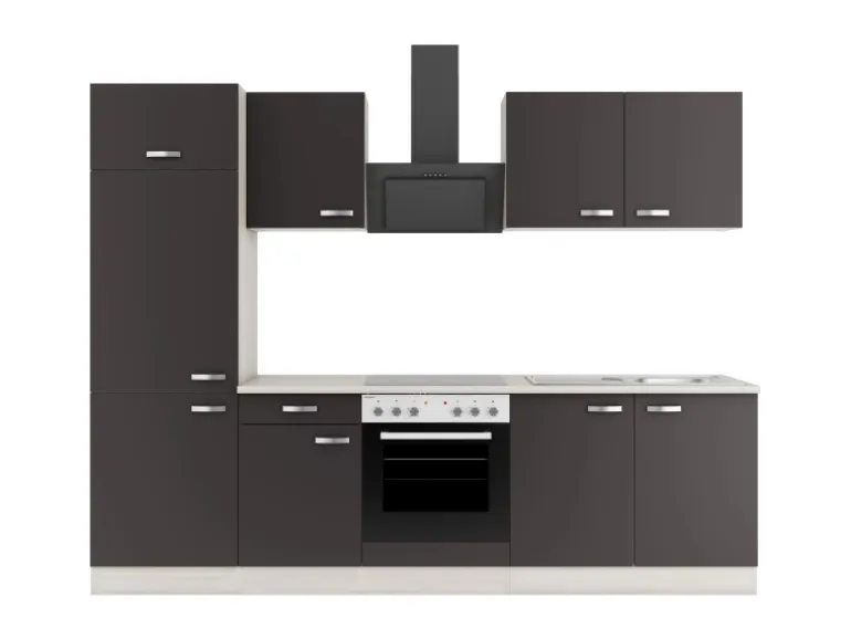 Die Serie Faro220 ist mit der Kombination aus Frontfarbe in Anthrazit mit Korpus und Arbeitsplatte in Akazie Nachbildung perfekt abgestimmt. Die gebürsteten Metallgriffe runden den Look ab und machen Ihre Küche zu einem echten Hingucker.